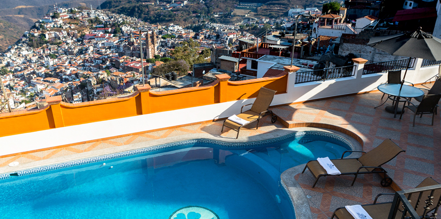 JUNIOR SUITE PANORAMICA Lujo, confort y la mejor vista de Taxco se suman para hacer de su estadia una experincia inolvidable. La habitación Junior Suite está equipada con una Cama King size, Tina de hidromasaje, Balcón con vista panorámica de Taxco, Baño, Servi-bar, Closet, Caja de seguridad, Teléfono, Agua de cortesía, Internet inalámbrico (wi-fi) y Pantalla TV con señal de cable.