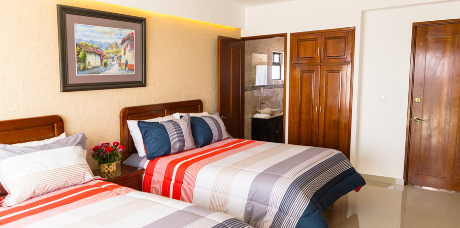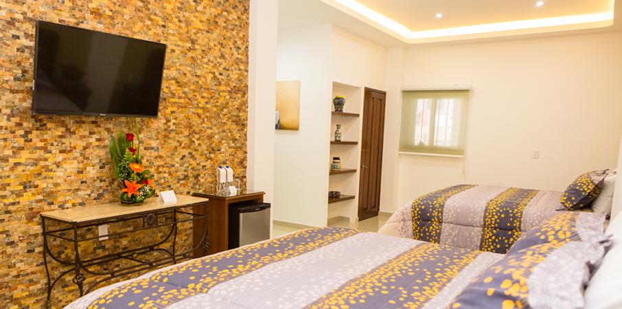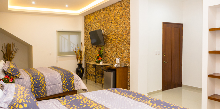 SUITE FAMILIAR SUITE DOBLE Amplia habitación que brinda privacidad y gran comodidad a sus huéspedes, que hacen de esta suite la ideal para familias. La Suite familiar cuenta con 2 Camas King Size, Baño, Closet, Servi-bar, Caja de seguridad, Teléfono, Agua de cortesía, Internet inalámbrico (wi-fi) y Pantalla TV con señal de cable. Una habitación con calidez, amplitud y comodidad. Donde los huéspedes, disfrutarán de la mejor vista de la ciudad. La Suite Doble cuenta con 2 Camas matrimoniales, Closet, Baño, Servi-bar, Balcón con vista panorámica a Taxco, Caja de seguridad, Teléfono, Agua de cortesía, Internet inalámbrico (wi-fi) y Pantalla TV con señal de cable.