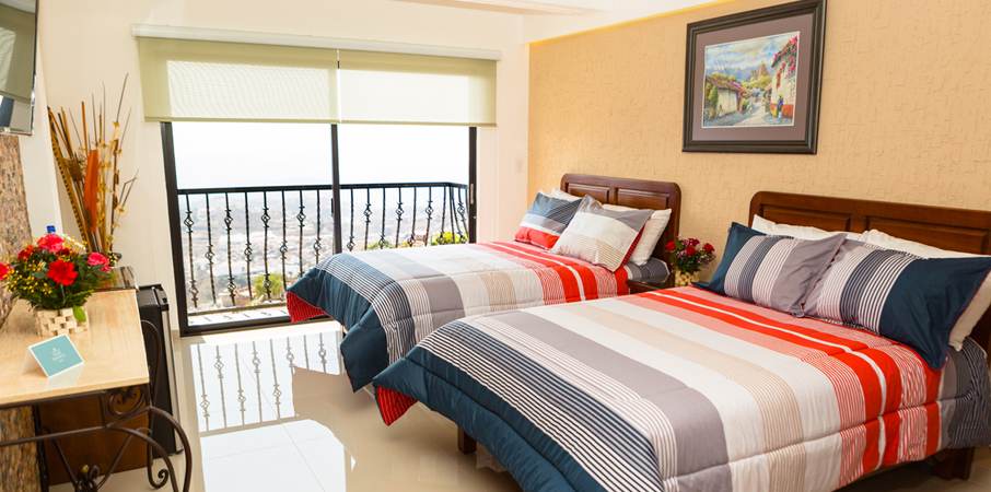 MASTER SUITE PANORÁMICA Amplia habitación con todos los servicios para disfrutar en familia. La Habitación Master Suite Panorámica cuenta con una Cama King Size, más una Matrimonial, vista panorámica de Taxco, Baño, Servi-bar, Closet, Caja de seguridad, Teléfono, Agua de cortesía, Internet inalámbrico (wi-fi) y Pantalla TV con señal de cable.